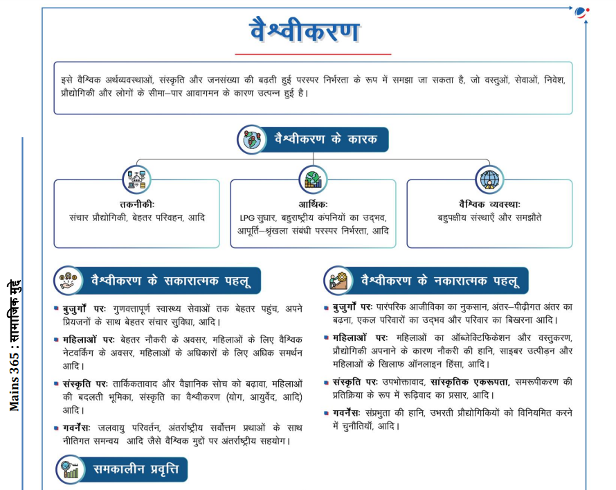 • शहरी प्रवास पर वैश्वीकरण के प्रभाव, विशेष रूप से कुशल, युवा, अविवाहित महिलाओं के बीच, Mains 365 के लेखों में विस्तार से बताया गया है। पारिवारिक संरचना और वैश्वीकरण ये रिसोर्स इस बात पर चर्चा करते हैं कि ये बदलाव व्यक्तिगत स्वतंत्रता और पारिवारिक रिश्तों को कैसे प्रभावित करते हैं, तथा व्यापक सामाजिक परिवर्तनों पर प्रकाश डालते हैं।