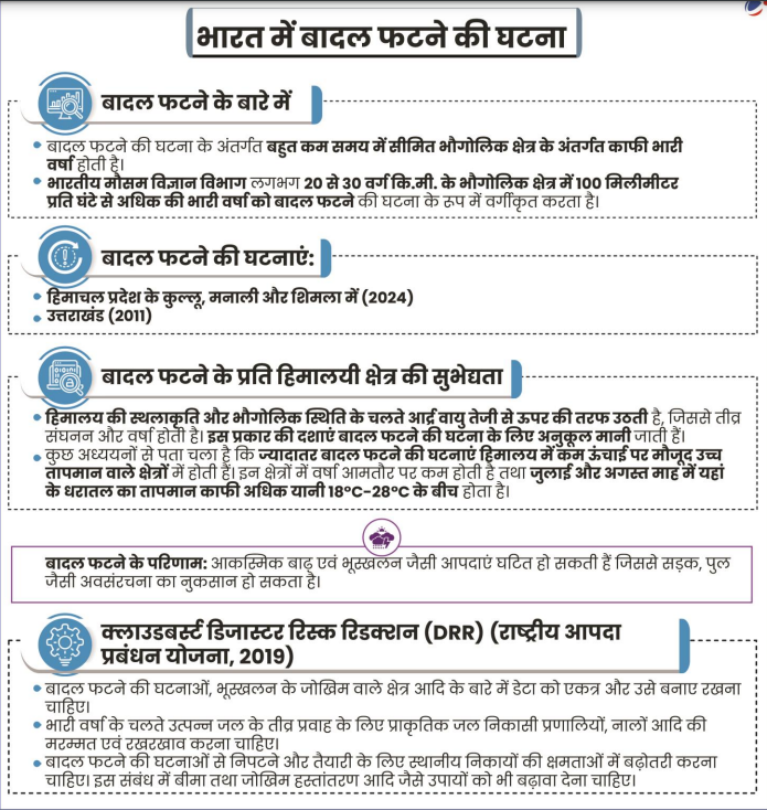 • बादल फटने की घटना, जिसके कारण अचानक और तीव्र वर्षा हो सकती है, को लेख में संक्षेप में समझाया गया है बादल फटने पर एक नजर Mains 365 से, उनकी घटनाओं और प्रभावों का अवलोकन प्रदान करते हुए।