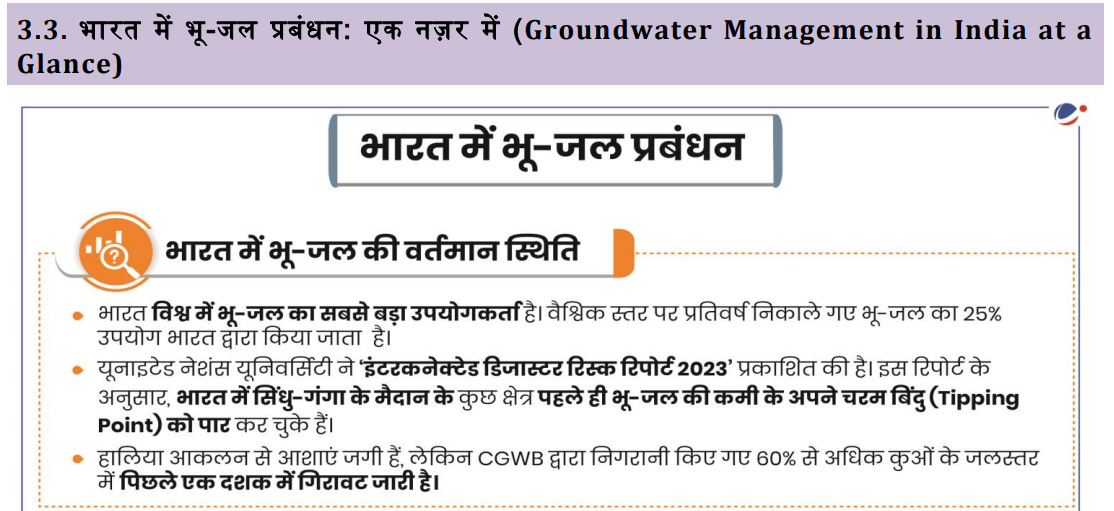 Q. भारत भूजल क्षरण के चरम बिंदु की ओर क्यों बढ़ रहा है? भूजल बहाली के लिए क्या रणनीति अपनाई जा सकती है। (ऑल इंडिया टेस्ट सीरीज, 2024)