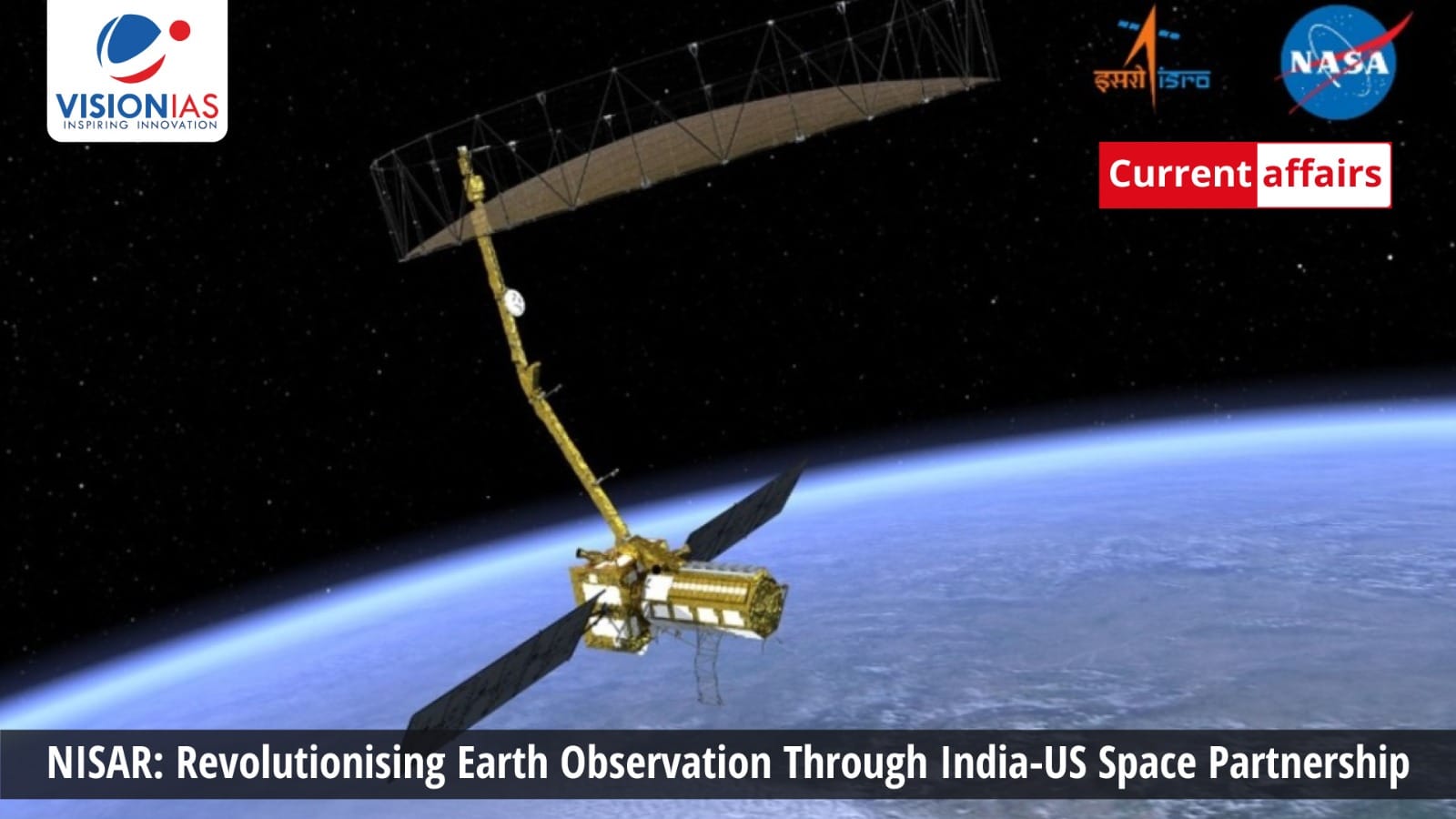 The NASA-ISRO Synthetic Aperture Radar (NISAR) launched from GSLV-F16 is a collaboration between the Indian Space Research Organisation (ISRO) and the National Aeronautics and Space Administration (NASA).
