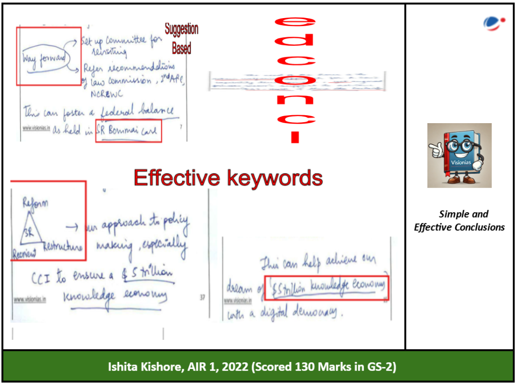 Ishita’s conclusions are diverse and well-crafted, ranging from suggestion-based and balanced perspectives to those incorporating impactful keywords. This variety ensures her answers conclude with relevance, direction, and a forward-looking perspective.