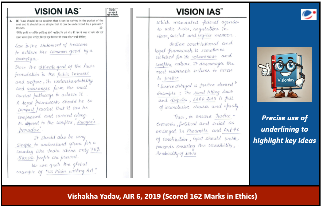 Vishakha uses underlining strategically to draw attention to key points in her answers. For instance, she highlights critical phrases or key terms like “common good” and “public interest” to ensure that the examiner easily grasps the essence of her arguments.