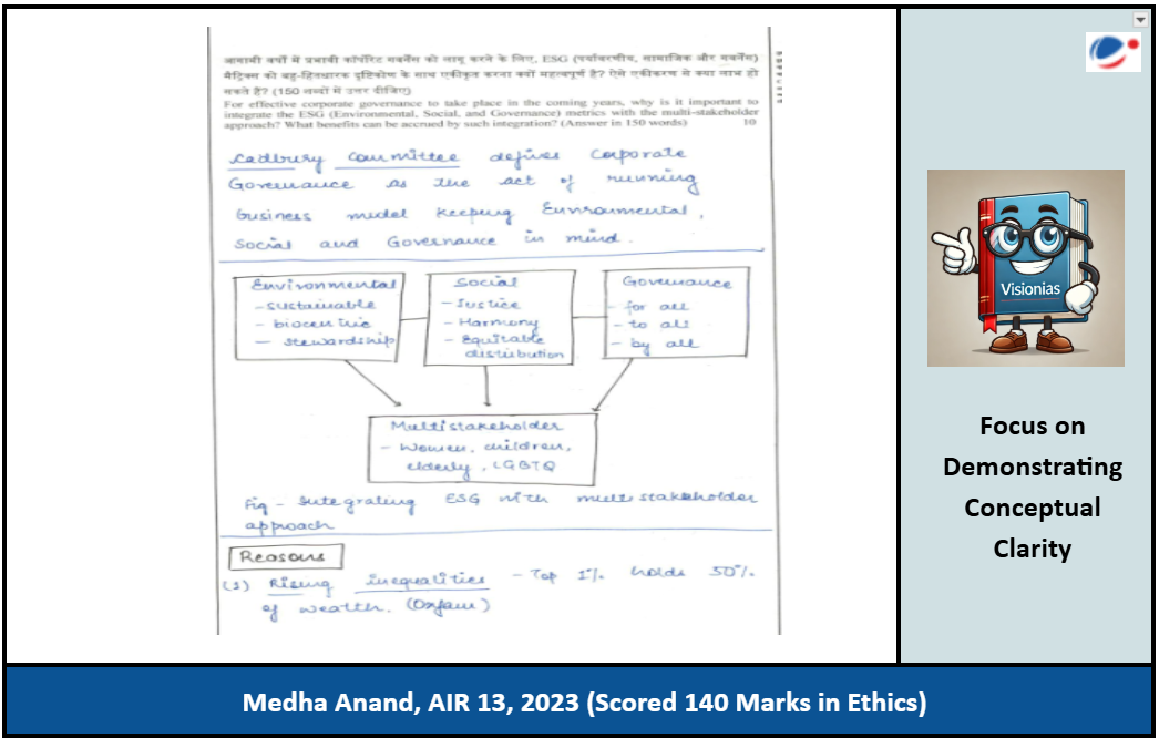For instance, in answer to a question on Citizens’ Charter and its ethical principles, Medha incorporates a neat illustration of virtuous cycle and in another question on corporate Governance uses a schematic of ESG’s multistakeholder approach.