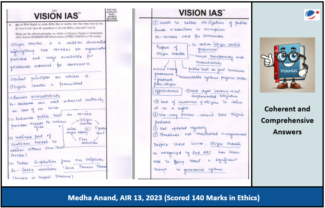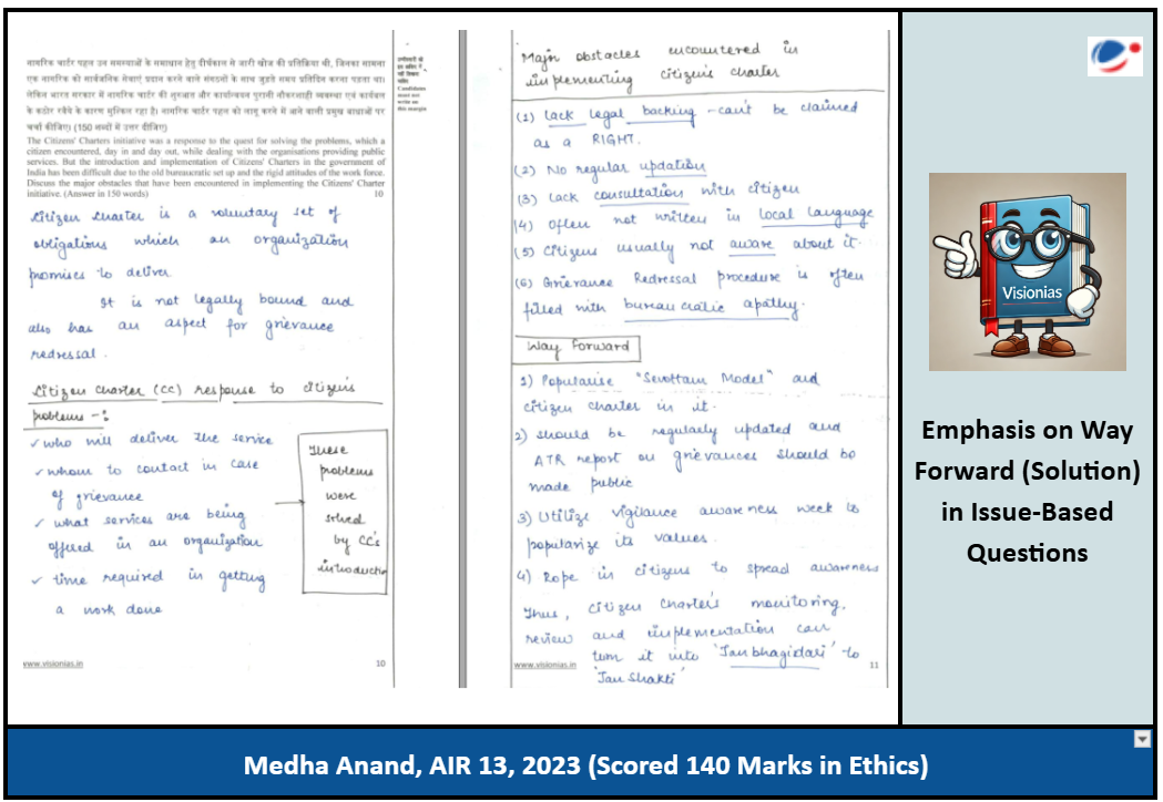 For instance, in answering a question on Citizen’s Charter, Medha first explains the key challenges like lack of legal backing, irregular updates, and bureaucratic apathy. She then outlines clear steps to address these problems under the “Way Forward” section such as promoting the Sevottam Model, ensuring regular updates, and encouraging citizen participation for better monitoring.