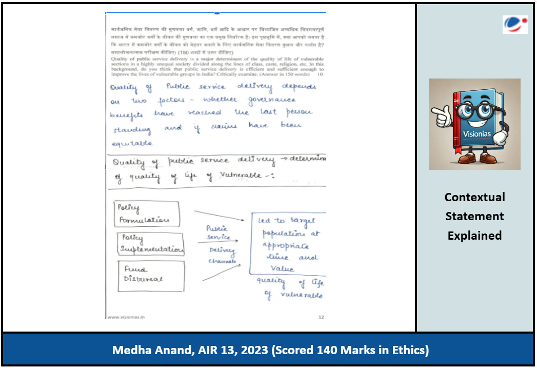 For instance, in a question about the quality of public service delivery and its impact on vulnerable sections, Medha clearly contextualizes the idea by breaking it into two key factors: whether governance benefits reach the last person and whether claims are equitable. She further supports this with a structured flowchart showcasing the link between policy formulation, implementation, and fund disbursal, which collectively determine the quality of life for the vulnerable population.
