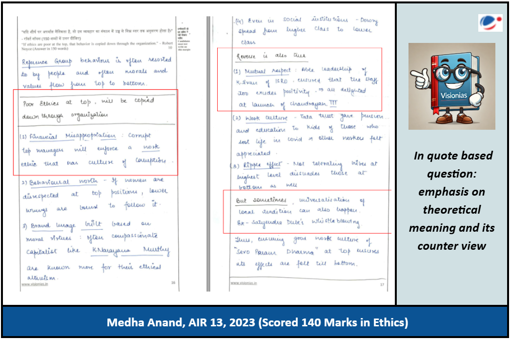 For example, in answering to the quote, “If ethics are poor at the top, that behavior is copied down through the organization,” Medha elaborates on how poor leadership can foster unethical behavior like financial misappropriation and a culture of corruption. She balances this argument with counter-examples like the positive leadership of ISRO’s K. Sivan, which inspired mutual respect and positivity among staff during Chandrayaan’s launch. Additionally, she highlights the “trickle effect” of ethical practices at the top, deterring unethical behavior at lower levels.