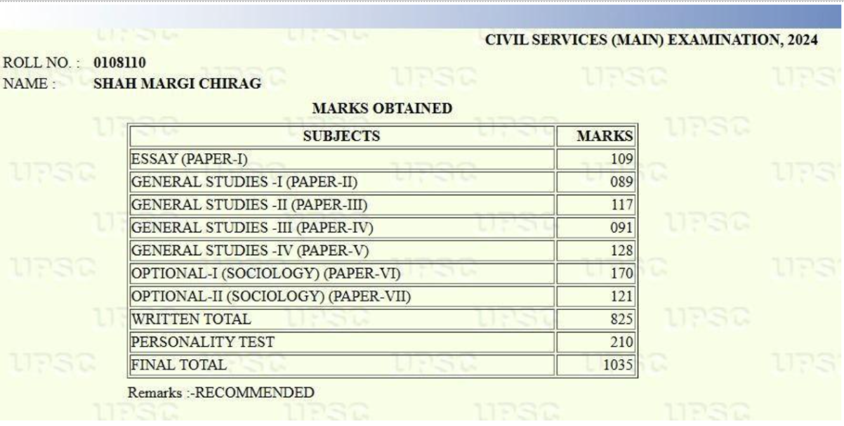 - Shah Margi Chirag’s UPSC CSE 2024 Marksheet