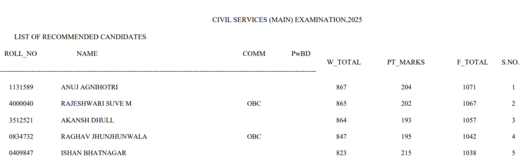 The UPSC Result 2025 PDF includes the roll numbers and names of recommended candidates arranged in order of merit.