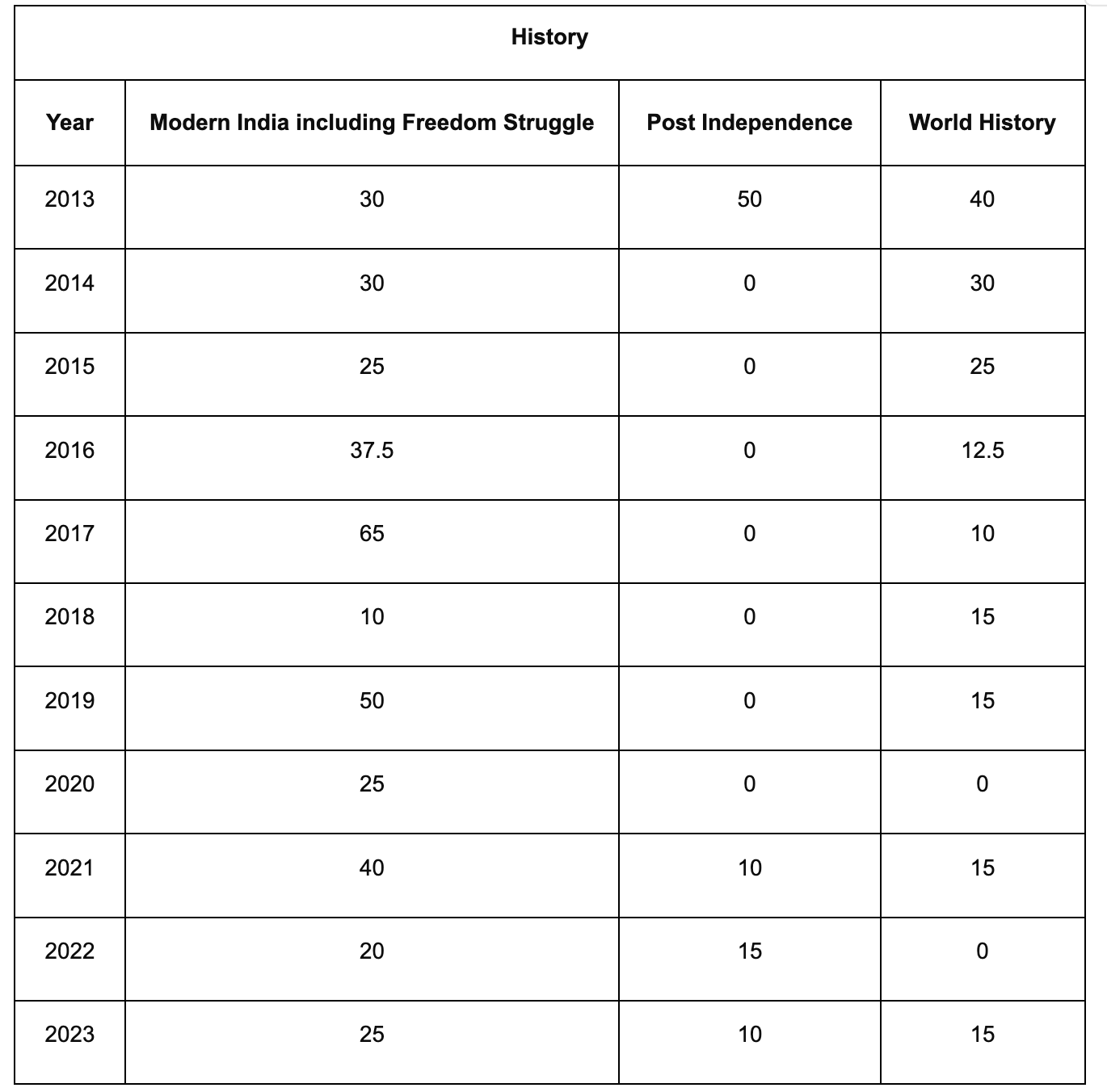 As far as World History is concerned, at least one question has been asked each year except 2020 and 2022. The topics like African history/nationalism, World Wars, anti-colonial struggles in other countries has been asked more than once. These topics should be given extra attention while preparing the subject.