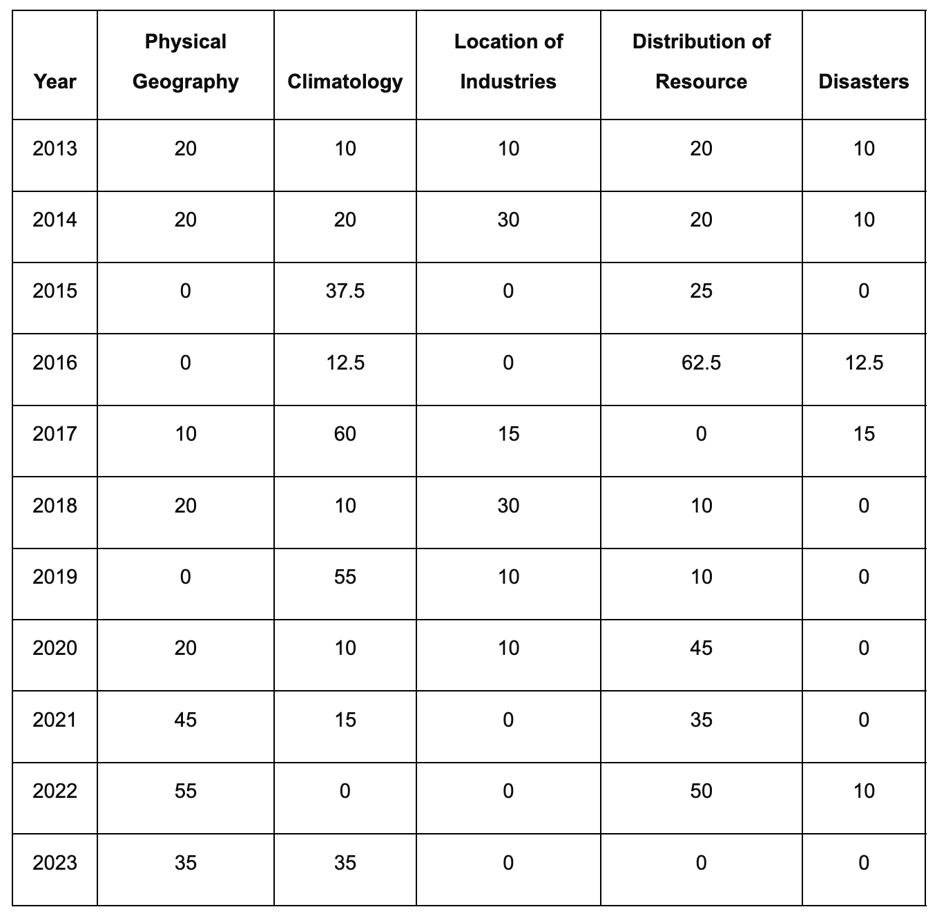 Among all the sections of the Geography, climatology is one section which has been asked each year since 2013. In the disasters section, topics are more often repeated. It may be because disasters which are in the news are asked in the examination. Since India is prone to landslides and cyclones, they have been asked multiple times.