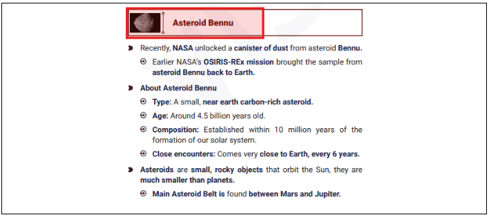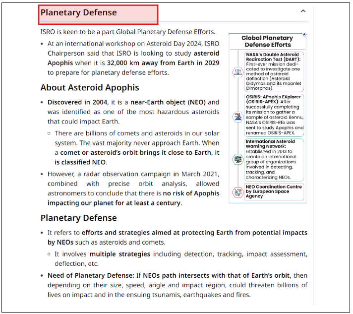 For this question, refer the Main 365 Updated Classroom Study Material on Global Planetary Defense, the Monthly Magazine July 2024 article on Planetary Defense, and the News Today articles on ISRO’s participation in Global Planetary Defense Efforts and Asteroid Bennu.