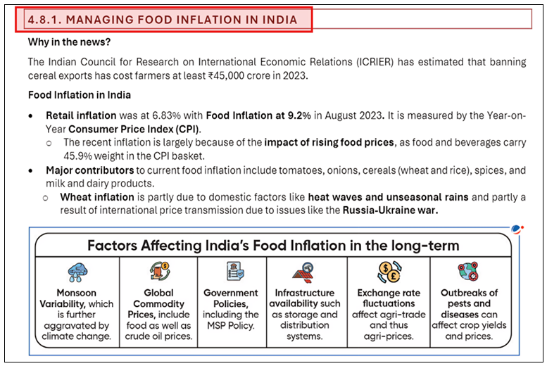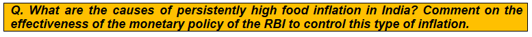 To answer this question effectively, consult the Mains 365 Economy section on Managing Food Inflation in India and the Monthly Magazine September 2023 article on Managing Food Inflation in India.