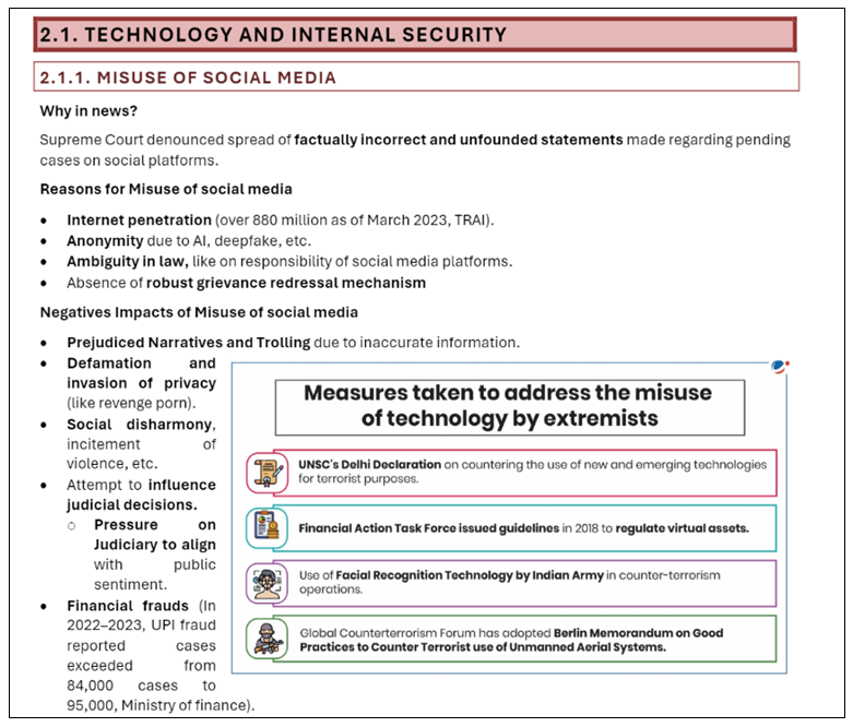 Security Issues: The Security section shows a strong connection to contemporary challenges, with approximately all 4 questions related to current affairs. There’s a new focus on emerging threats like narco-terrorism. Border security and management remain crucial topics, with questions exploring both traditional and non-traditional security challenges. The inclusion of questions on social media and encrypted messaging services highlights the evolving nature of security threats in the digital age.