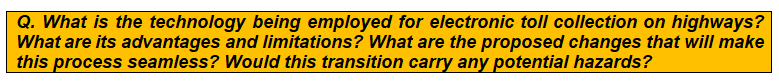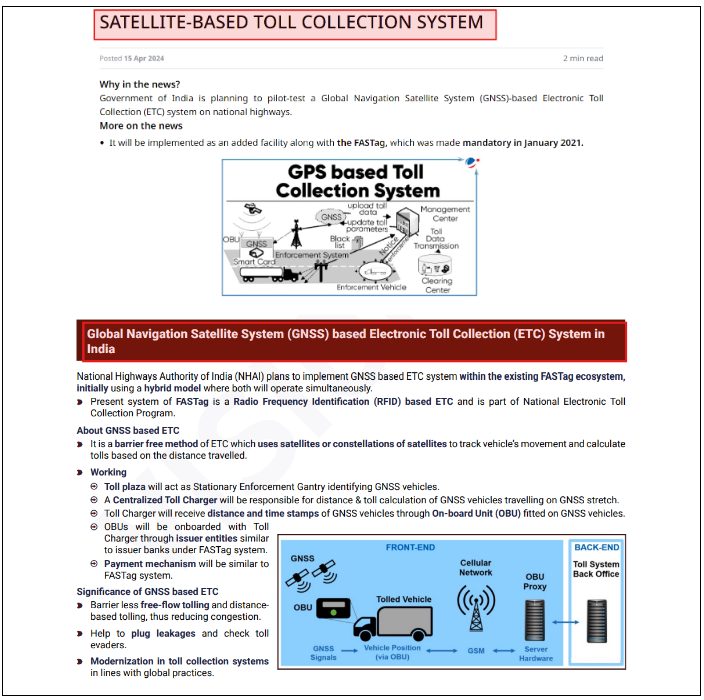 This question can be answered using information from the Mains 365 Satellite-Based Collection System, Monthly article on Satellite-Based Collection Systems and News Today on Global Navigation Satellite System (GNSS) based Electronic Toll Collection (ETC) System in India.