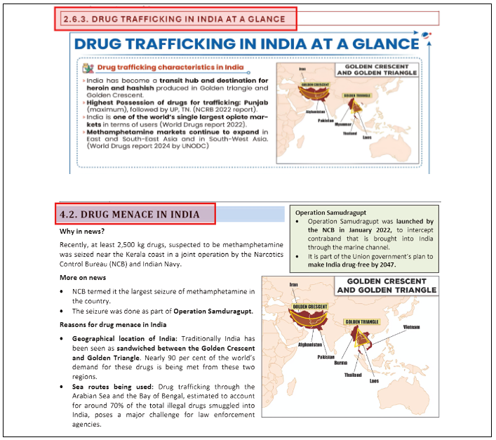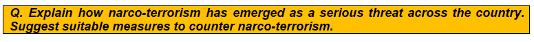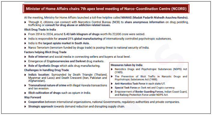 This question can be addressed using information from the Mains 365 Security section on Drug Trafficking in India at a Glance, Monthly Magazine article on Drug Menace in India and News Today on Narco-Coordination Centre (NCORD) meeting.