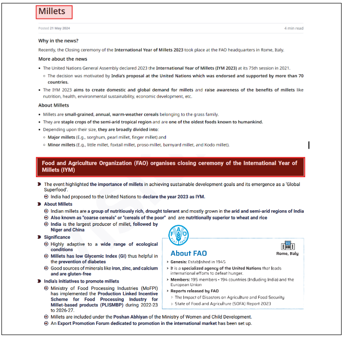 In order to write answer to this question, refer the Monthly Magazine April 2024 section on Millets and the News Today article on the FAO’s closing ceremony of the International Year of Millets.
