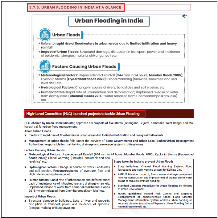 Synthesize information from the Mains 365 Updated section on Urban Flooding in India at a Glance and the News Today article on High-Level Committee launched projects to tackle Urban Flooding.