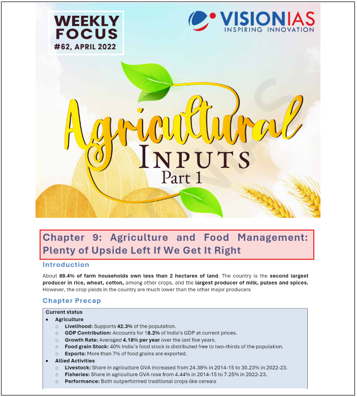 Combine insights from the Weekly Focus on Agricultural Inputs Part I and the Summary of Economic Survey 2023-24 Chapter 9 on Agriculture and Food Management.
