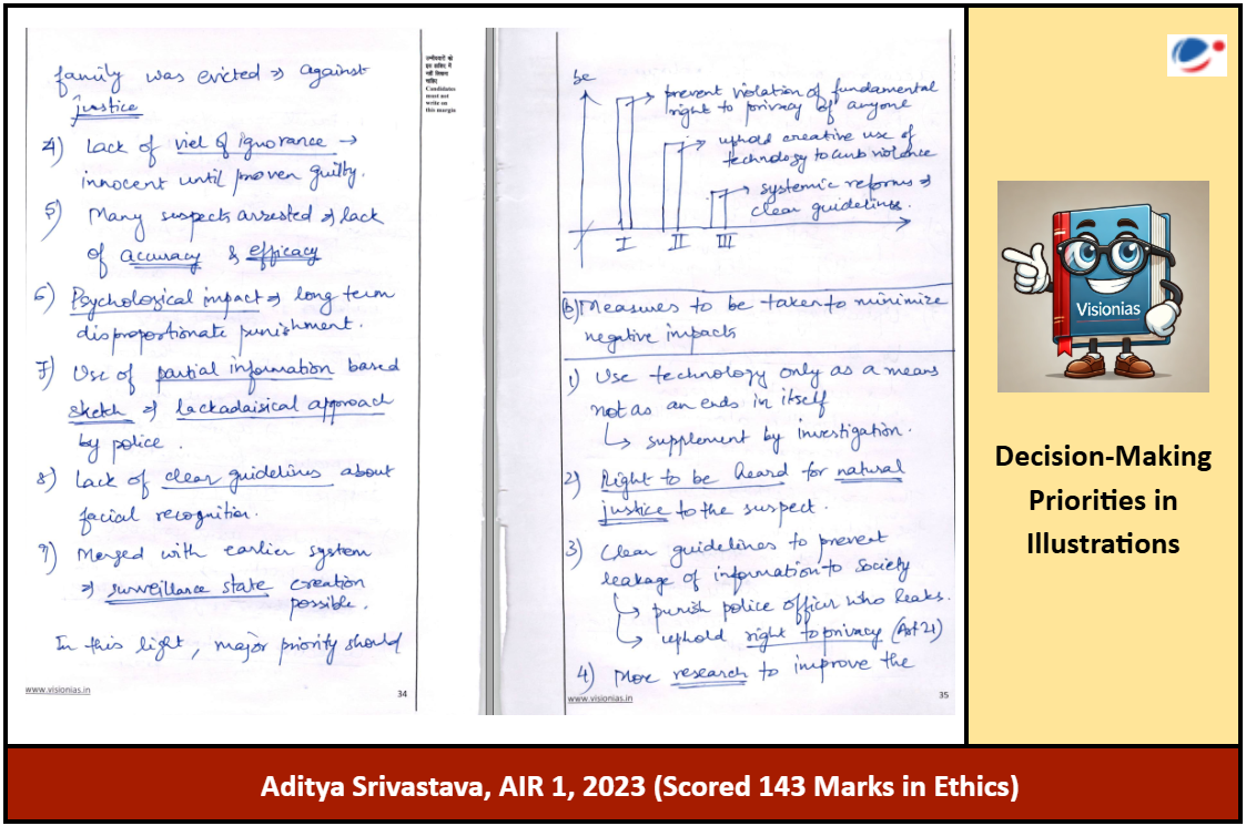 Aditya’s use of simple illustrations to represent his decision-making priorities is a notable feature of his Ethics answers. By employing visual tools, he simplifies complex ideas and ensures clarity in his arguments. This approach helps the examiner quickly follow his logical flow and understand the prioritization of issues