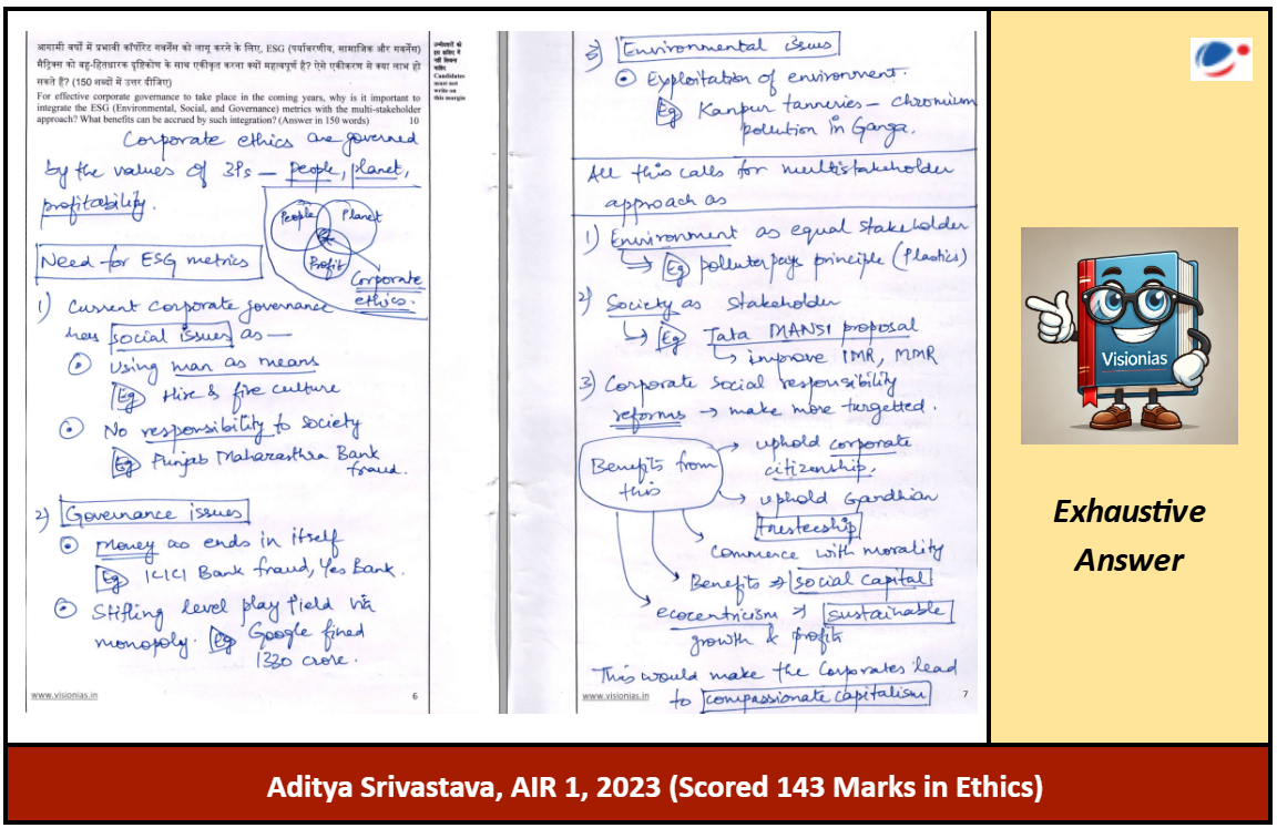For instance, in questions related to corporate ethics and governance, Aditya meticulously covers all relevant aspects—ethical challenges, stakeholders, and actionable reforms. He highlights the importance of integrating ESG (Environmental, Social, and Governance) metrics to achieve responsible corporate behavior. By emphasizing values like people, planet, and profitability (3Ps), he provides a holistic framework for governance issues.