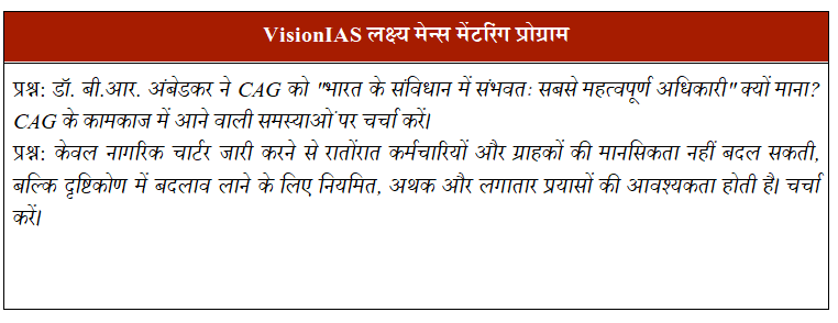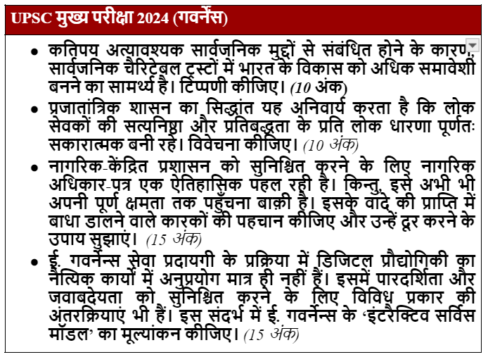 - नागरिक चार्टर और जवाबदेही: नागरिक चार्टर पर 2024 का प्रश्न नागरिक-केंद्रित प्रशासन को बढ़ावा देने में इसकी भूमिका को संबोधित करता है, साथ ही इसकी सफलता में आने वाली बाधाओं की पहचान करता है। पिछले वर्षों के प्रश्न भी इसी तरह सेवा के अधिकार अधिनियम और जवाबदेही ढांचे जैसे सुधारों के माध्यम से सार्वजनिक सेवा वितरण में सुधार पर केंद्रित थे।