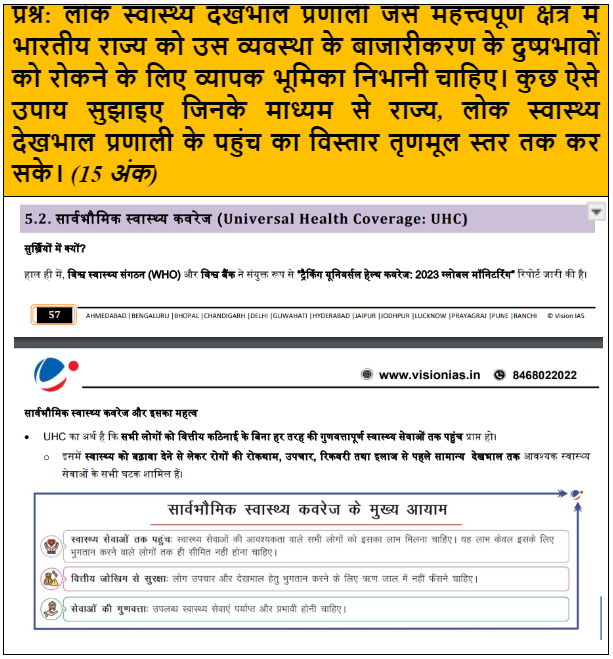इस प्रश्न के लिए सार्वजनिक स्वास्थ्य सेवा प्रणाली में मौजूदा चुनौतियों और उनसे निपटने के लिए सरकार की पहलों को समझना आवश्यक है। VisionIAS Mains 365 संसाधनों का लाभ उठाएँ जिसमें सार्वभौमिक स्वास्थ्य कवरेज और डिजिटल स्वास्थ्य के साथ मिलकर प्रासंगिक उपायों और नीतिगत प्रतिक्रियाओं की चर्चा की गई है।