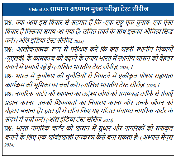 UPSC मुख्य परीक्षा GS पेपर 2 में, कई टॉपिक्स VisionIAS रिसोर्स से निकटता से जुड़े हुए हैं जो हमारी सामग्री द्वारा प्रदान की गई व्यापक कवरेज को दर्शाता है। उदाहरण के लिए, गोपनीयता के अधिकार पर प्रश्न को हमारे वैल्यू एडेड मटेरियल (VAM) द्वारा सीधे संबोधित किया गया था, जिससे छात्रों को इस महत्वपूर्ण टॉपिक की गहन समझ प्राप्त हुई। इसी तरह, स्थानीय निकायों और सुशासन से जुड़े मुद्दों पर भी हमारे VAM में गहनता से चर्चा की गई, जिससे जमीनी स्तर पर शासन सुधारों के बारे में विस्तृत जानकारी दी गई थी।