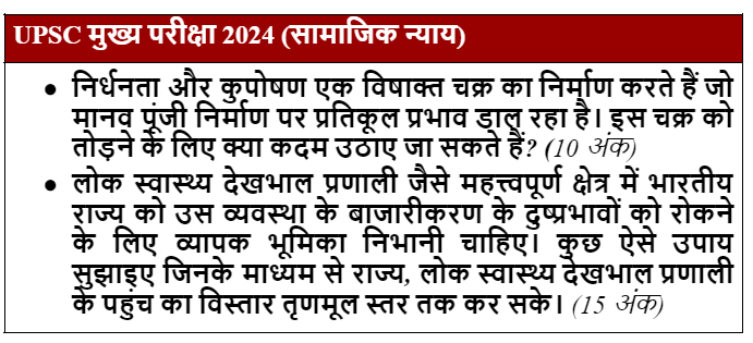 - जन – स्वास्थ्य सेवा: स्वास्थ्य सेवा पर बाजारीकरण के प्रतिकूल प्रभाव पर 2024 का प्रश्न स्वास्थ्य सुधार के विषय में एक नया आयाम जोड़ता है। सार्वभौमिक स्वास्थ्य सेवा और आयुष्मान भारत पर पिछले प्रश्न नीति मूल्यांकन पर केंद्रित थे, जबकि 2024 का प्रश्न निजीकरण और जमीनी स्तर पर स्वास्थ्य सेवा की पहुँच पर गहराई से चर्चा करता है।