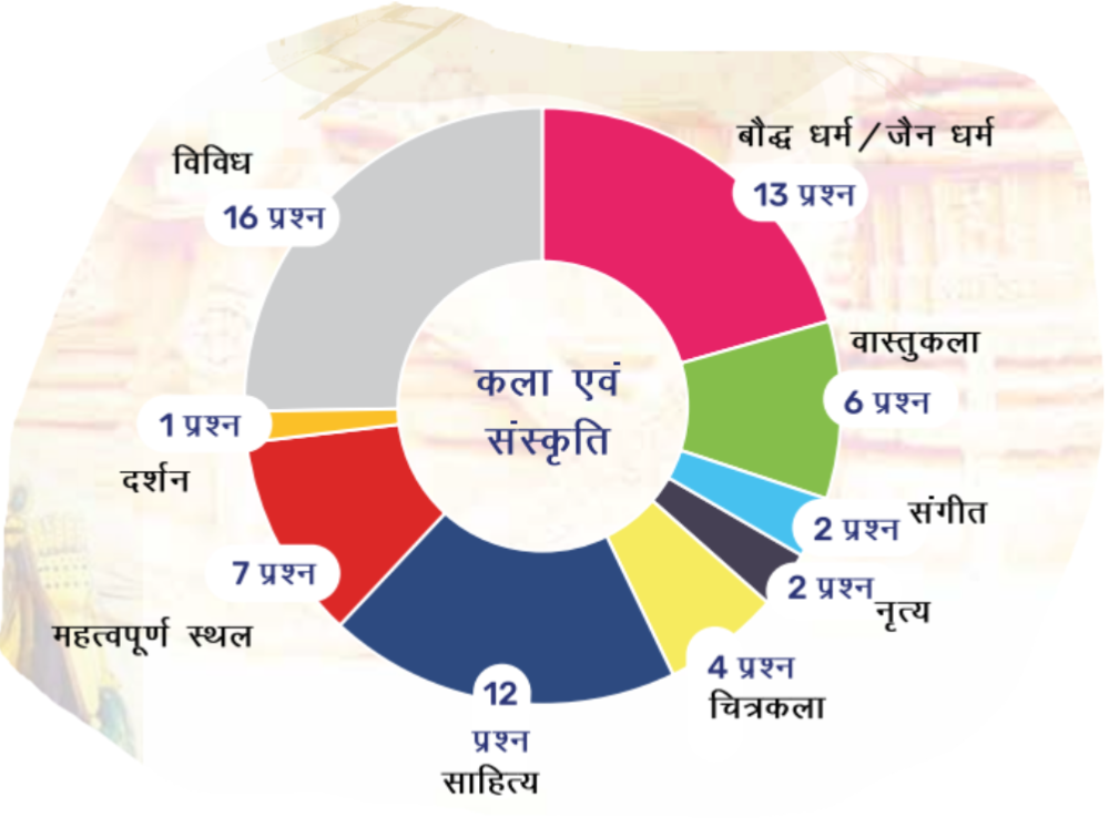 • 2015 से 2024 तक, UPSC प्रारंभिक परीक्षा के प्रश्नपत्रों में प्राचीन कला और वास्तुकला, जैन एवं बौद्ध दर्शन, शास्त्रीय नृत्य रूप, ऐतिहासिक स्मारक, पुरातात्विक खोज, यूनेस्को विश्व धरोहर स्थल और सांस्कृतिक घटनाएं जैसे विषय लगातार आते रहे हैं।