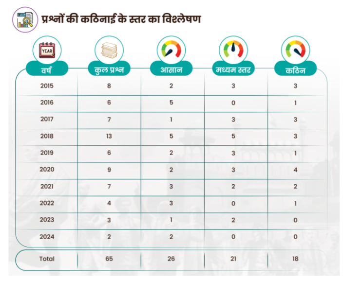 – आधुनिक इतिहास में अधिकांश प्रश्न स्थिर और मानक स्रोतों से आए हैं, जिसने समग्र कठिनाई स्तर को मध्यम बना दिया है। हालांकि, जिन तथ्यों को परीक्षा में पूछा गया, वे कठिन थे।