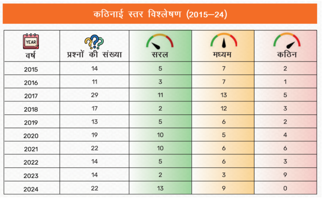 पिछले 10 वर्षों में, UPSC प्रारम्भिक परीक्षा के प्रश्नों में भारतीय राजव्यवस्था का हिस्सा लगातार 15-20% रहा है। प्रश्नों का कठिनाई स्तर तथ्यात्मक (Factual) से लेकर अवधारणात्मक (Conceptual) और अनुप्रयोग-आधारित (Application-Based) तक होता है।