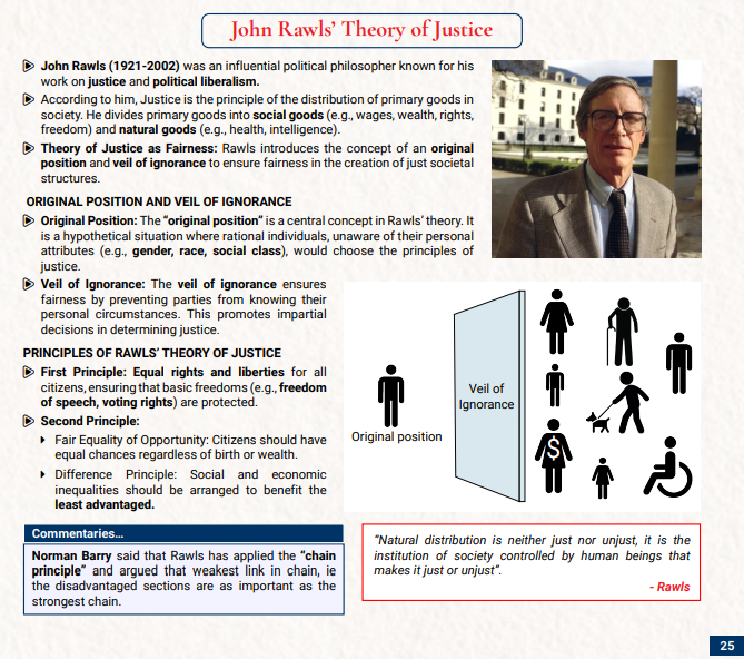 • Rawls’ and his Views: The Vision IAS PSIR Tests model answer explains Rawls’ framework on justice through the original position, veil of ignorance, and his two principles—equal basic liberties and social-economic inequalities (difference principle and fair equality of opportunity).