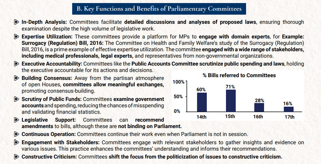 Q. Parliamentary committees are indispensable to the legislative process. It provides to the opportunity for cross-pollination between two chambers of the Parliament. Discuss