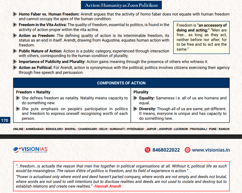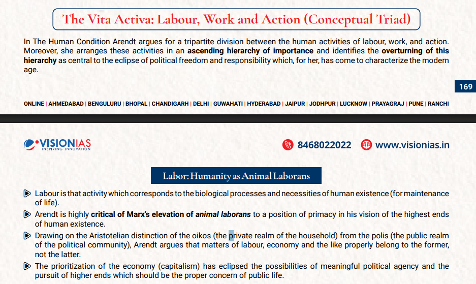 • Vision IAS PSIR Optional Test Series Q: The distinctions between labour, work, and action are central to Arendt’s political thought. Examine how these categories elucidate the human condition. (test 3340 Question 4 a)