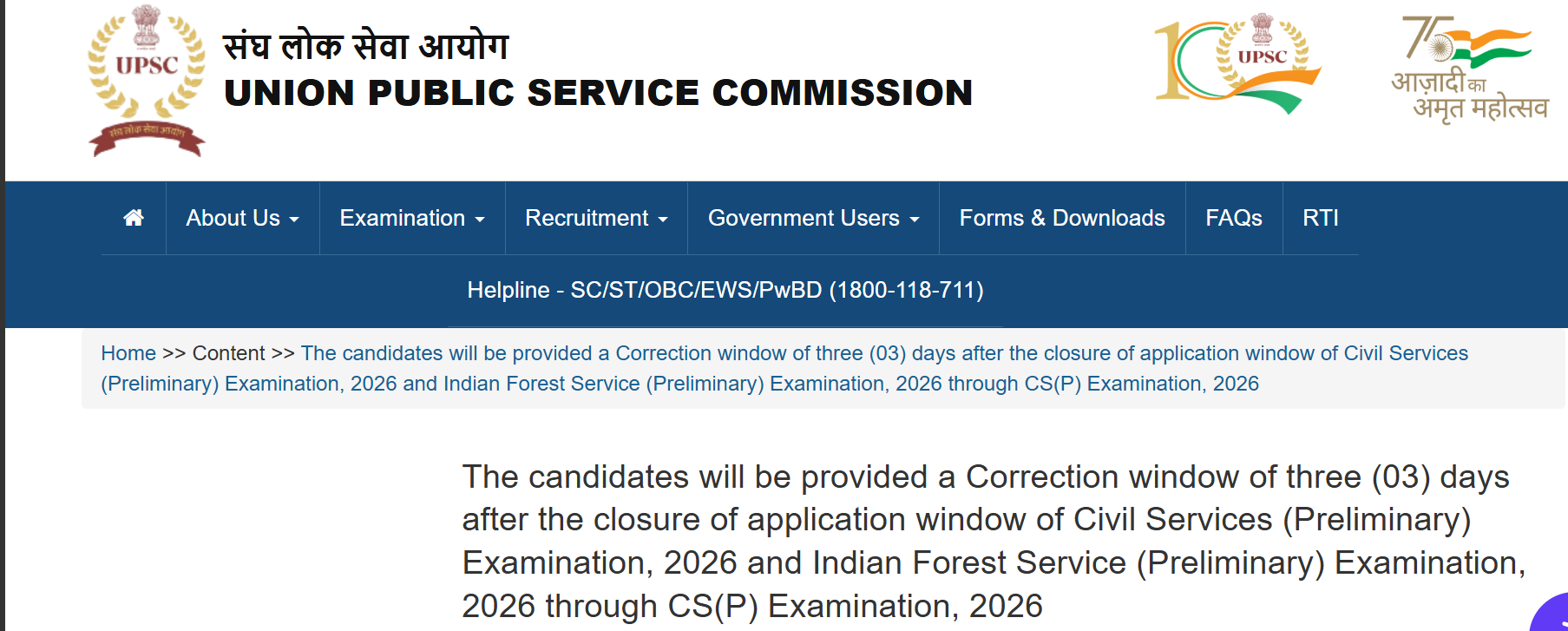 In another important update, UPSC has announced that candidates will be provided a Correction Window of three (03) days after the closure of the application window for the Civil Services (Preliminary) Examination, 2026 and Indian Forest Service (Preliminary) Examination, 2026 through the CS(P) Examination, 2026.